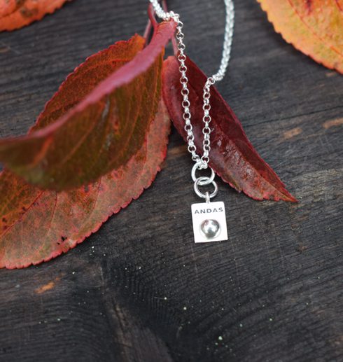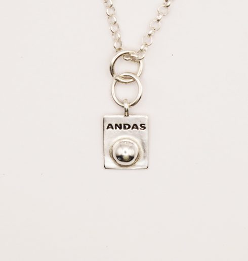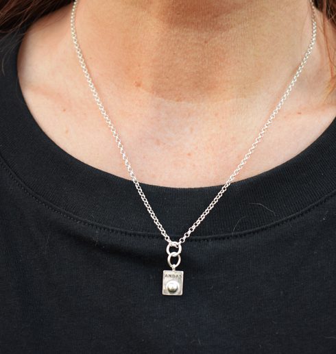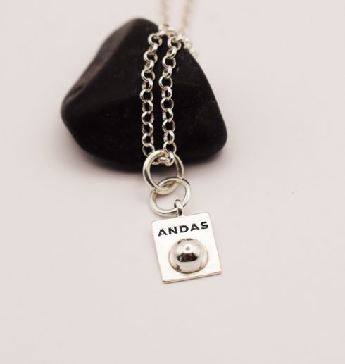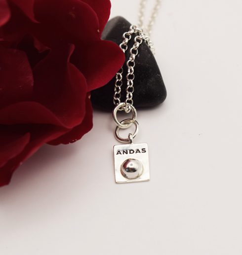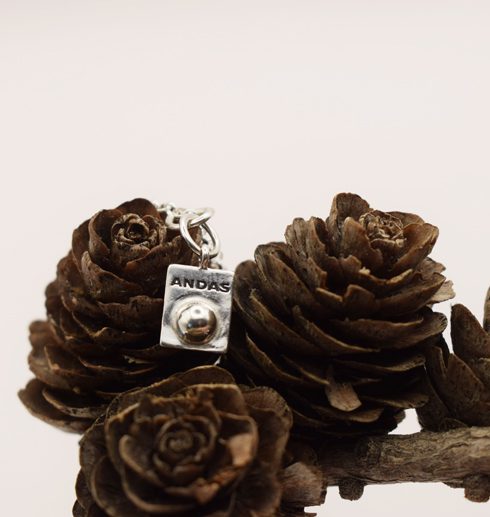 Detta är ett interaktivt litet smycke, samma som i kollektionen ”ANDAS”. Precis som de andra smyckena i ANDAS-kollektionen så är tanken med den lilla silverknoppen att du ska använda den för att stimulera flera sinnen samtidigt. Du ska känna på kulan på smycket och påminns om att andas. Genom att aktivera flera sinnen blir det lättare att slappna av: Du känner, ser och ANDAS.